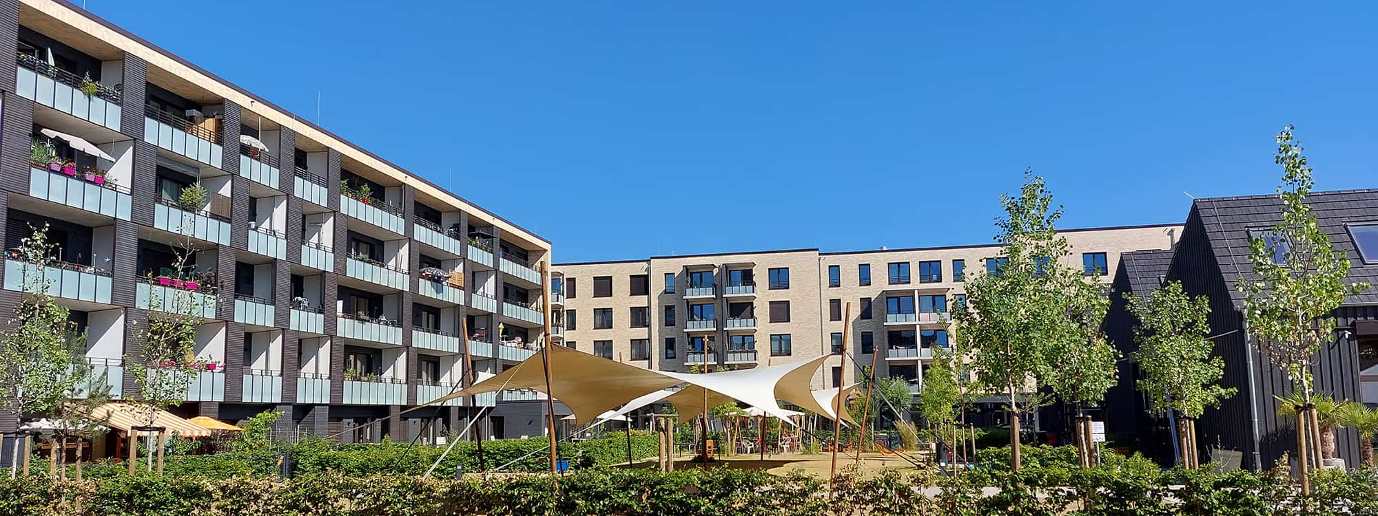 Das Viertel selbst ist Autofrei und schmiegt sich in die vorhandenen Bestandsgebäude ein.