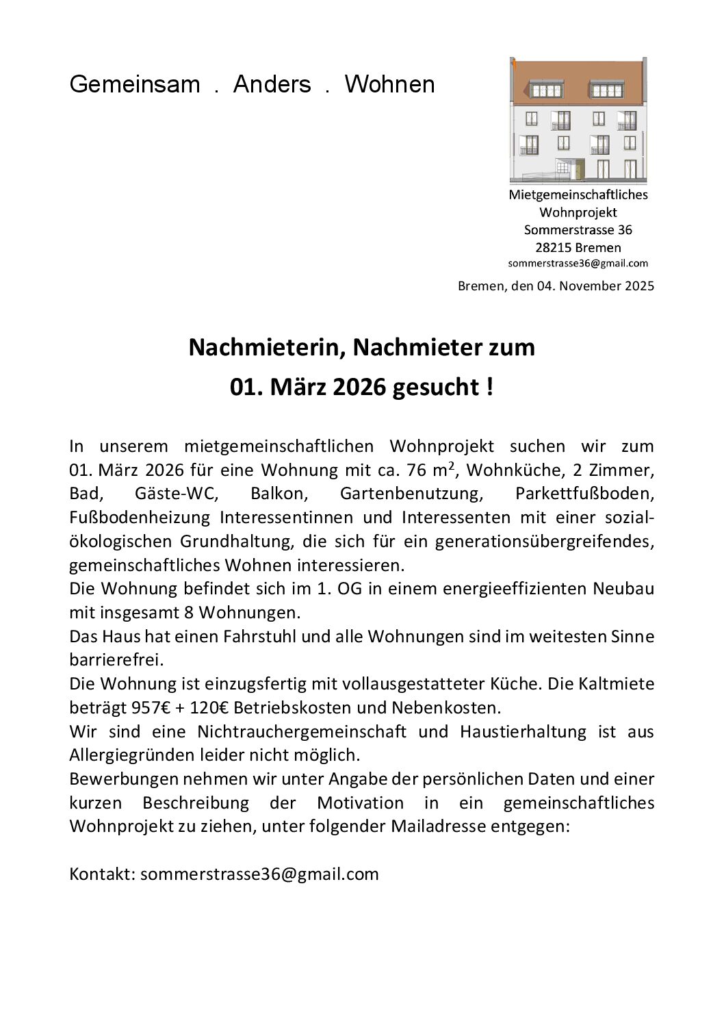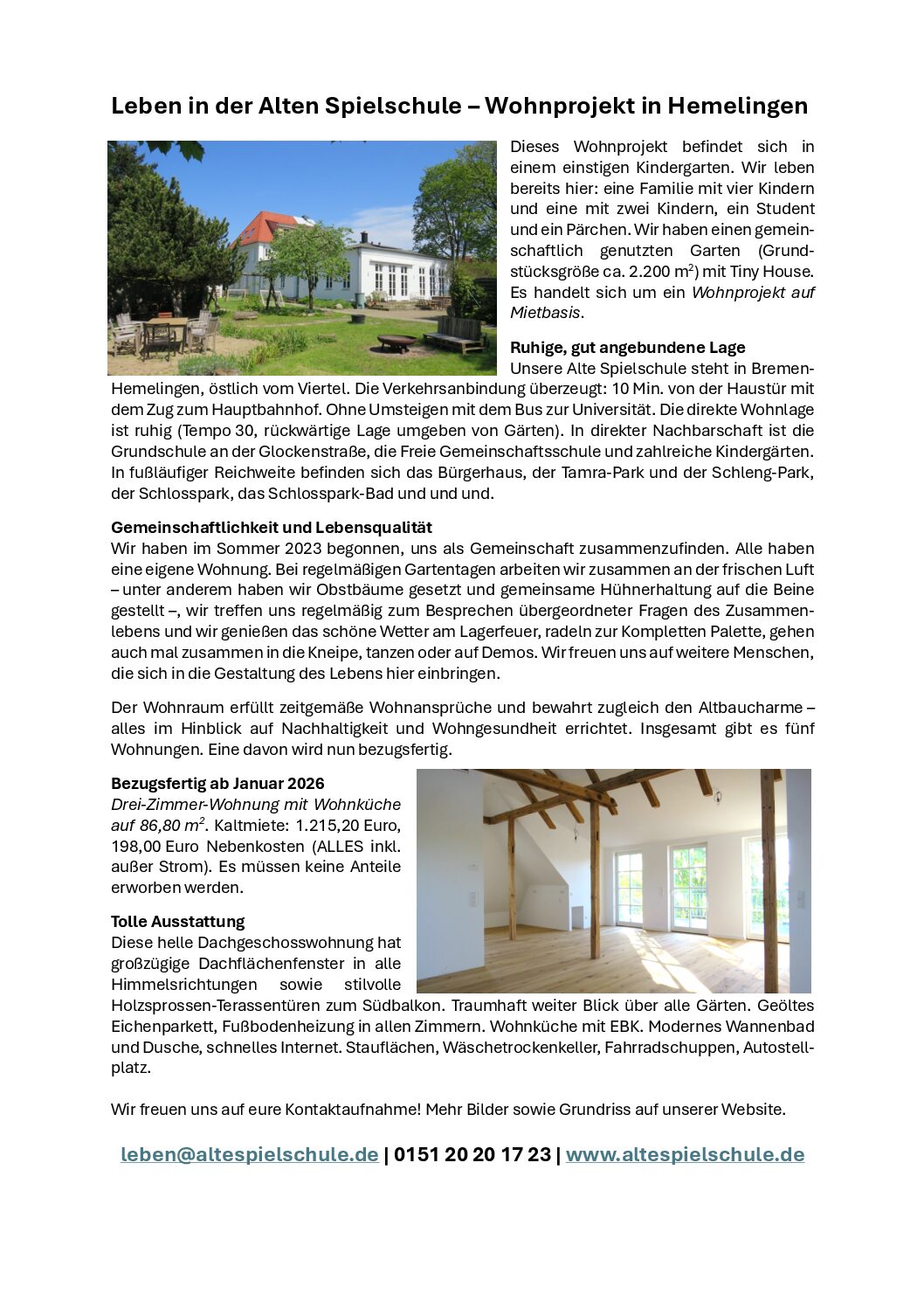 Wichtig zu wissen: Wir verkaufen keinen Wohnraum, der vermietet werden kann, sprich Du/Sie musst in unserer Gemeinschaft wohnen, wenn Interesse an einer Wohnung besteht.